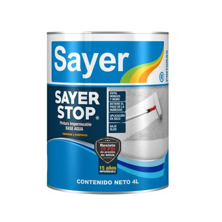 SAYER STOP es una pintura impermeable base agua, formulada con polímeros de última generación en combinación con la más alta tecnología en aditivos y pigmentos para dar como resultado un recubrimiento de gran resistencia a la humedad y filtraciones de agua. Es ideal para impermeabilizar una gran variedad superficies que está en contacto con agua. SAYER STOP puede ser utilizado para impermeabilizar estanques de agua, muros de contención, sótanos, cimientos y mampostería en general, tanto en interior como en exterior.